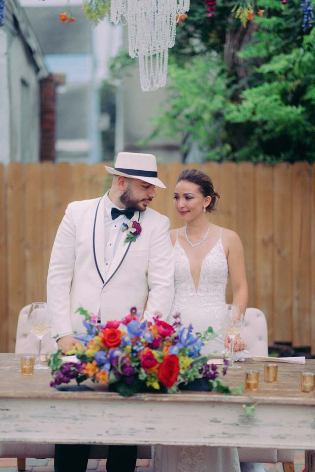 They wanted to work in the new fountain and pergola in their backyard as well as some of the street art around the area that they love, including a beautiful bee mural that the bride painted on the fence at her parent’s home right around the corner from their house. Their first date was at St. Roch Market where they ate at Fete au Fete so they knew they wanted to have them cater their reception as well.